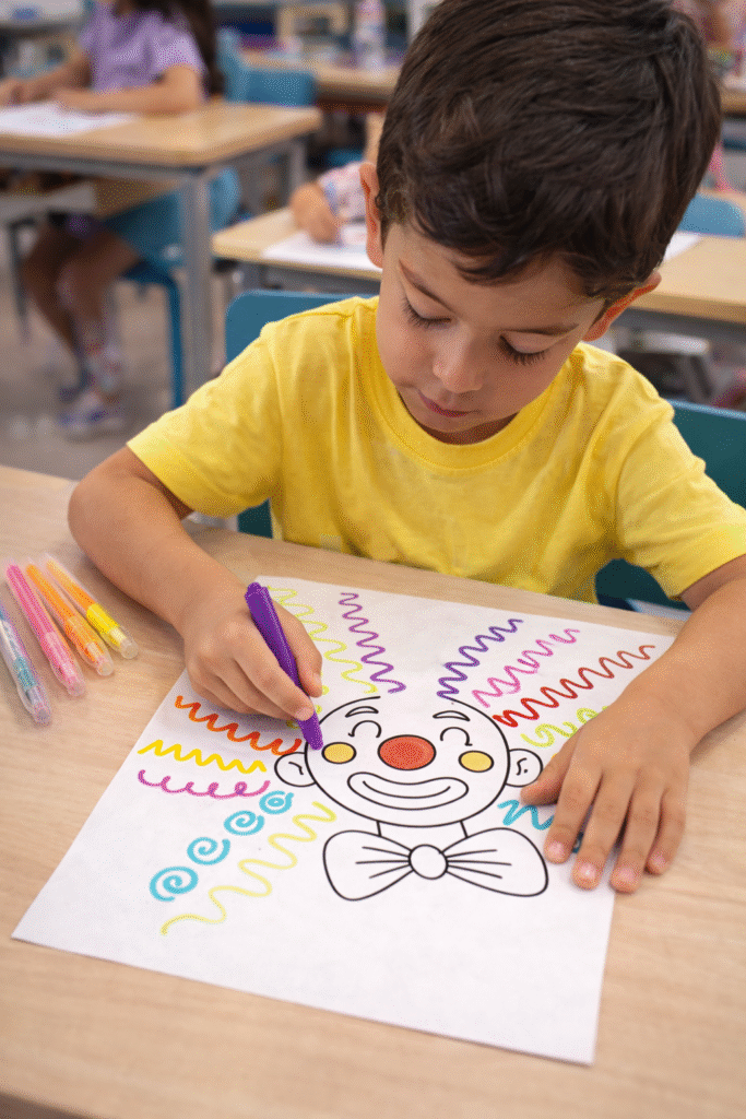 2️⃣ Explique que o cabelo do palhaço deve ser preenchido com traçados variados (ondinhas, zigue-zague, espiral, linhas curvas).